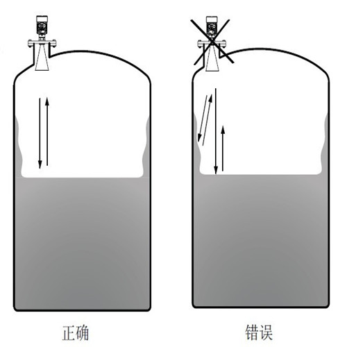 如果傳感器沒用對準介質表面安裝的話,測量信號就會減弱。必須將雷達傳感器的軸線垂直對準介質表面。