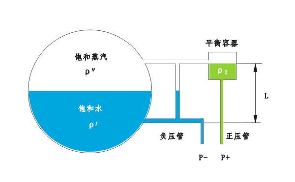 公式中,H為汽包水位高度;ρ1為平衡容器中水的密度;ρ′為汽包飽和水密度、ρ″為汽包內(nèi)飽和蒸汽的密度;L為汽包上、下連通管間距離。由公式可知,平衡容器結(jié)構(gòu)確定后(即L為已知常數(shù)),在汽包壓力維持恒定(ρ′、ρ″確定)以及ρ1一定的條件下,正、負(fù)導(dǎo)壓管的差壓輸出△P與汽包水位H呈單值函數(shù)關(guān)系。因此,若P+、P-接差壓變送器,就可根據(jù)所測出的差壓數(shù)值知道相應(yīng)的液位值。