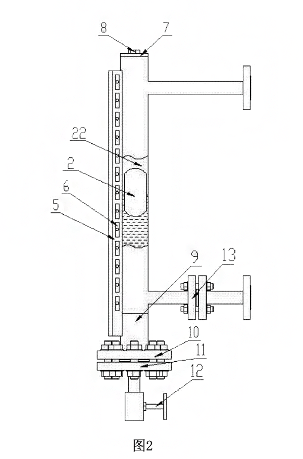 磁浮球呈膠囊狀且內(nèi)部設(shè)有空腔,磁浮球一端開口,磁浮球的空腔內(nèi)安裝有兩個(gè)加強(qiáng)支撐環(huán),兩加強(qiáng)支撐環(huán)之間安裝有環(huán)形**強(qiáng)磁鋼塊,磁浮球開口端焊接有封堵頭。氣泡消除器與磁浮球通道連通的一端安裝有濾網(wǎng),濾網(wǎng)上設(shè)有不規(guī)則形狀的碎泡口,有機(jī)玻璃管一端安裝有密封的堵頭,另一端安裝有單向閥堵頭,單向閥堵頭上安裝用于將有機(jī)玻璃管內(nèi)氣體抽出的單向閥作為優(yōu)選的技術(shù)方案,液位計(jì)主體內(nèi)磁浮球通道的直徑比磁浮球的外直徑大-mm。