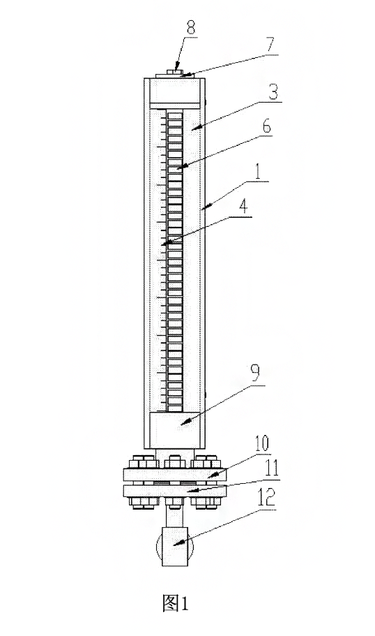 以下附圖僅旨在于對(duì)本新型做示意性說明和解釋,并不限定本新型的范圍。其中圖是本新型磁翻板液位計(jì)實(shí)施例的結(jié)構(gòu)示意圖