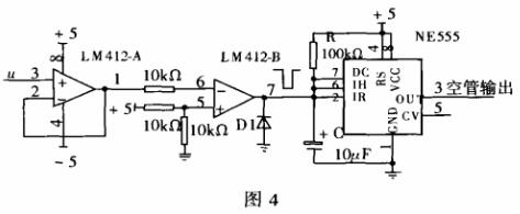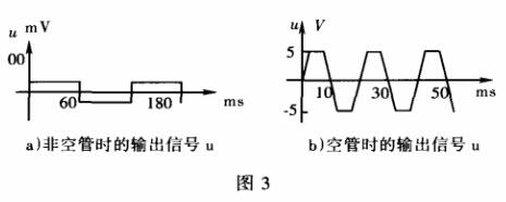 當(dāng)傳感器不是空管時(shí),由于比較器電路始終輸出高電平,不能觸發(fā)定時(shí)器工作,定時(shí)器輸出為低電平。而傳感器為空管時(shí),比較器的輸出脈沖不斷地觸發(fā)定時(shí)器,若T大于20ms時(shí),定時(shí)器的輸出信號(hào)始終為高電平。因此,單片機(jī)只要通過(guò)檢測(cè)定時(shí)器的輸出信號(hào),便可知道是否為空管。