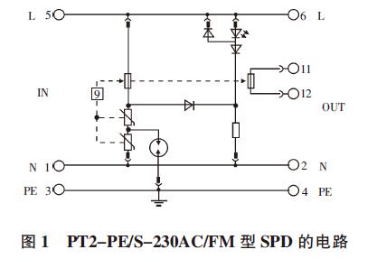 壓敏電阻損壞時(shí), 熔絲熔斷, 發(fā)光二極管導(dǎo)通發(fā)出紅光, 提示更換, 同時(shí), 端子11 和12 由常閉變常開(kāi), 提供開(kāi)關(guān)量報(bào)警。