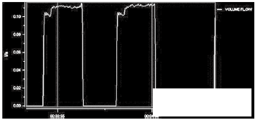 灌裝頭的終出口部分為10~14mm的可更換縮口。通過縮口,可以產(chǎn)生背壓,一般縮口內置蜂窩狀虹吸管,保證灌裝前后的管道滿管。從測試的流量波形上看,10mm的灌裝頭產(chǎn)生適當?shù)淖枘嵝Ч?,流量曲線較穩(wěn)定。
