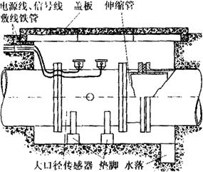 由于大口徑管道在多數(shù)場(chǎng)合下是埋在地下的,因此大口徑傳感器在安裝前應(yīng)做好水泥地坑。圖6-19所示是在給排水系統(tǒng)中常見的安裝形式。水泥地坑應(yīng)有足夠的活動(dòng)空間,側(cè)壁埋有敷設(shè)電纜的鋼管,上有蓋板防止雨淋,下有泄水管以免坑內(nèi)積水而使傳感器侵水。為了拆裝方便,傳感器應(yīng)放在墊腳上,且在下游側(cè)裝有活絡(luò)的伸縮管。圖6-20是電磁流量計(jì)在地下水泥管污水排放系統(tǒng)中的安裝實(shí)例。