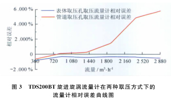 例, 系統(tǒng)運行時間為 6 0s , 標準裝置的滯止平均溫度為2 9. 7℃ , 空間平均濕度為 4 2% , 流量計的平均溫度為2 9. 3℃ , 在表體取壓孔取壓和管道取壓孔取壓的流量計檢定試驗數(shù)據(jù)分別如表 3 、 4 所示。兩種取壓方式下的流量計相對誤差曲線如圖3所示。
