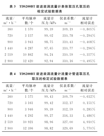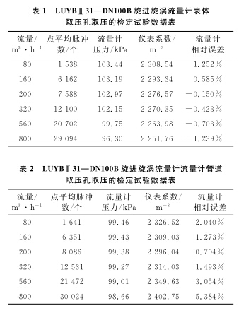 以使用**的D N 1 0 0 B天然氣流量計為例, 系統(tǒng)運行時間為6 0s , 標準裝置的滯止平均溫度為 2 8. 9℃ , 空間平均濕度為 3 0% , 流量計的平均溫度為 2 8. 3℃ , 在表體取壓孔取壓和管道取壓孔取壓的流量計檢定試驗數(shù)據(jù)分別如表 1 、 2 所示。
