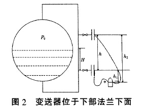 變送器位于下部法蘭下面.和圖1一樣使用常用的高壓側(cè)接下面、負(fù)壓側(cè)接上面的引壓方式,變送器的布置和常規(guī)電廠高加液位測量以及常見密閉容器測量液位一樣.如圖2所示 這種安裝方式一般需要把變送器布置于容器所在平臺的下一層變送器正壓側(cè)所受的壓力為:
