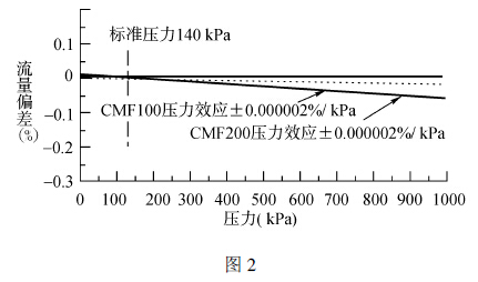 從圖2 中, 我們可以看出壓力對測量準(zhǔn)確度的影響:當(dāng)工藝壓力增大, 會使流量計產(chǎn)生一個負(fù)向偏差, 表現(xiàn)為流量顯示值比實(shí)際值偏小;當(dāng)壓力減小時, 會使流量計產(chǎn)生一個正向偏差, 表現(xiàn)為流量顯示值比實(shí)際值偏大。