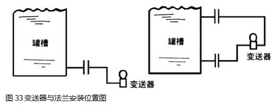 差壓式液位變送器安裝在流程接頭的上方則需要零位負遷移,。法蘭式液位變送器的安裝與使用見圖35。