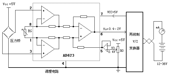 四、.兩線制壓力變送器設(shè)計 壓力橋、稱重傳感器輸出信號微弱,都屬于mV級信號。這一類小信號一般都要求用差動放大器對其進行*先級放大。一般選用低失調(diào)、低溫飄的差動放大器。另外在兩線制應(yīng)用中,低功耗也是必需的。AD623是常用的低功耗精密差動放大器,常用在差分輸出前級的放大。 AD623失調(diào)大200uV,溫飄1uV/度,在一般壓力變送應(yīng)用保證了精度足夠。 R0將0.4V疊加在AD623的REF腳(5腳)上,在壓力=0情況下通過調(diào)整R0使輸出4mA,再調(diào)整RG輸出20.00mA,完成校準。 電路設(shè)計時需注意,壓力橋傳感器相當于一個千歐級的電阻,耗電一般比較大。適當降低壓力橋的激勵電壓可以減小耗電電流。但是輸出幅度也隨之下降,需要提高AD623的增益。圖6給出的傳感器采用恒壓供電,實際應(yīng)用中大部分半導體壓力傳感器需要恒流供電才能獲得較好的溫度特性,可以用一個運放構(gòu)成恒流源為其提供激勵。