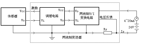 一、.兩線制變送器的結(jié)構(gòu)與原理 兩線制變送器的原理是利用了4~20mA信號為自身提供電能。如果變送器自身耗電大于4mA,那么將不可能輸出下限4mA值。因此一般要求兩線制變送器自身耗電(包括傳感器在內(nèi)的全部電路)不大于3.5mA。這是兩線制變送器的設(shè)計根本原則之一。 從整體結(jié)構(gòu)上來看,兩線制變送器由三大部分組成:傳感器、調(diào)理電路、兩線制V/I變換器構(gòu)成。傳感器將溫度、壓力等物理量轉(zhuǎn)化為電參量,調(diào)理電路將傳感器輸出的微弱或非線性的電信號進行放大、調(diào)理、轉(zhuǎn)化為線性的電壓輸出。兩線制V/I變換電路根據(jù)信號調(diào)理電路的輸出控制總體耗電電流;同時從環(huán)路上獲得電壓并穩(wěn)壓,供調(diào)理電路和傳感器使用。 除了V/I變換電路之外,電路中每個部分都有其自身的耗電電流,兩線制變送器的核心設(shè)計思想是將所有的電流都包括在V/I變換的反饋環(huán)路內(nèi)。如圖,采樣電阻Rs串聯(lián)在電路的低端,所有的電流都將通過Rs流回到電源負極。從Rs上取到的反饋信號,包含了所有電路的耗電。在兩線制變送器中,所有的電路總功耗不能大于3.5mA,因此電路的低功耗成為主要的設(shè)計難點。下面將逐一分析各個部分電路的原理與設(shè)計要點。