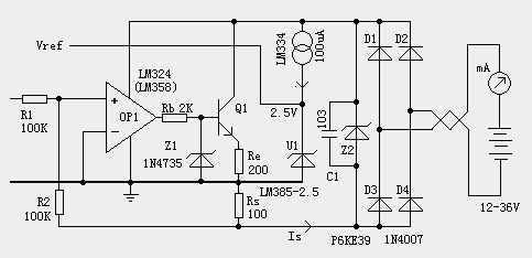 五、穩(wěn)定性和安全性的考慮 工業(yè)環(huán)境下環(huán)境惡劣且對可靠性要求高,因此兩線制變送器的設(shè)計上需要考慮一定的保護和增強穩(wěn)定性措施。 1.電源保護。 電源接反、超壓、浪涌是工業(yè)上常見的電源問題。電源接反是設(shè)備安裝接線時容易發(fā)生的錯誤,輸入口串一只二極管即可防止接反電源時損壞電路。如果輸入端加一個全橋整流器,那么即使電源接反仍能正常工作。為防止雷擊、靜電放電、浪涌等能量損壞變送器,變送器入口處可以加裝一只TVS管來吸收瞬間過壓的能量。一般TVS電壓值取比運放極限電壓略低,才能起到保護作用。如果可能遭受雷擊,TVS可能吸收容量不夠,壓敏電阻也是必需的,但是壓敏電阻本身漏電會帶來一定誤差。 2.過流保護。 設(shè)備運行過程中可能有傳感器斷線、短路等錯誤情況發(fā)生。或者輸入量本身很有可能超量程,變送器必須保證任何情況下輸出不會無限制上升,否則有可能損壞變送器本身、電源、或者遠方顯示儀表。 圖中Rb和Z1構(gòu)成了過流保護電路。無論什么原因?qū)е翺P1輸出大于6.2V(1N4735是6.2V穩(wěn)壓管),都會被Z1鉗位,Q1的基極不可能高于6.2V。因此Re上電壓不可能高于6.2-0.6=5.6V,因此總電流不會大于Ue/Re = 5.6V/200=28mA。 3.寬電壓適應(yīng)能力。 一般兩線制變送器都能適應(yīng)大范圍的電壓變化而不影響精度。這樣可以適用各類電源,同時能夠適應(yīng)大的負載電阻。對電源敏感的部分是基準源,同時基準源也是決定精度的主要元件。3樓圖中基準通過R5限流,當電源電壓變化時,R5上電流也隨之改變,對基準穩(wěn)定性影響很大。附圖中利用恒流源LM334為基準供電,電壓大范圍變化時,電流基本不變,保證了基準的穩(wěn)定性。 4.退藕電容 一般的電路設(shè)計中,每個集成電路的電源端都會有退藕電容。在兩線制變送器上電時,這些電容的充電會在瞬間導致大電流,有可能會損壞遠方儀表。因此每個退藕電容一般不超過10nF,總退藕電容不宜超過50nF。入口處一個10nF電容是必需的,保證長線感性負載下,電路不震蕩。