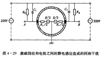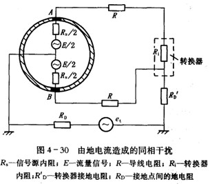 一是由于激磁繞組和電極之間的靜電感應(yīng)引起的同相干擾,如圖4-29所示,在激磁繞組和電極A, B之間存在絕緣電阻RM和分布電容Cf,激磁電壓通過(guò)RM和Cf及兩電極之間的內(nèi)阻,對(duì)地產(chǎn)生同相的干擾電勢(shì)et。