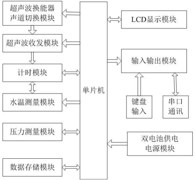 簡(jiǎn)介:本實(shí)用新型公開了一種大口徑超聲波流量計(jì),包括單片機(jī)、壓力測(cè)量模塊、超聲波換能器聲道切換模塊、超聲波收發(fā)模塊、計(jì)時(shí)模塊、水溫測(cè)量模塊、數(shù) 據(jù)存儲(chǔ)模塊和雙電池供電電源模塊;單片機(jī)控制計(jì)時(shí)模塊產(chǎn)生時(shí)鐘脈沖,計(jì)時(shí)模塊與單片機(jī)通信,給超聲波收發(fā)模塊和水溫測(cè)量模塊提供時(shí)鐘脈沖信號(hào);同時(shí)單片機(jī) 通過超聲波換能器聲道切換模塊,進(jìn)行超聲波流量測(cè)量的雙聲道間的切換;計(jì)時(shí)模塊接收雙聲道的超聲波收發(fā)模塊和水溫測(cè)量模塊的測(cè)量數(shù)據(jù),并將數(shù)據(jù)傳至單片 機(jī);數(shù)據(jù)存儲(chǔ)模塊用于將數(shù)據(jù)分類且分芯片存儲(chǔ);雙電池供電電源模塊為單片機(jī)供電;壓力測(cè)量模塊與單片機(jī)連接。本實(shí)用新型采用雙聲道超聲波計(jì)量方式,根據(jù)時(shí) 差法測(cè)量的基本原理,完成高精度的測(cè)量。